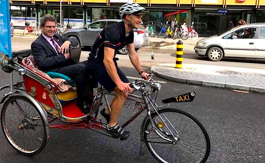 Unsere Rikscha, ein Original aus Thailand, ist für den Strassenverkehr zugelassen. Sie ist solide gebaut, hat Gangschaltung und bietet auf dem gepolsterten Rücksitz gut und gerne Platz für zwei Personen. Die Fahrt wird von einem erfahrenen Velokurier begleitet. Für eine Tour mit der Rikscha eignen sich asphaltierte und eher flache Strecken und Fahrten bis zu etwa einer halben Stunde. Für Regenwetter ist die Rikscha leider nicht geeignet.